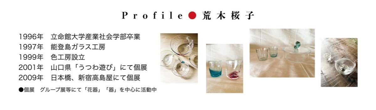開催メッセージ ● みやこの東南・炭山。この地はまた「つくり手」の里。多様な作家・職人が多彩な品々を生み出す~“Arts & Crafts”の花ひらく~山里でもあります。 ● 炭山に住まい、工房を営む荒木桜子さん(ガラス作家|『色工房』主宰)をお迎えする今回の企画展では、繊細にしてどこかあたたかい〜日々のいとなみに寄り添うような〜作品の数々をご覧いただきたいと存じます。|紅椿それいゆ・店主 敬白