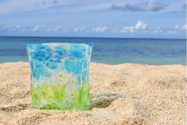ガラス器の内に 写し取ったかのような“おんなブルー”。 ●故郷への溢れる想いも込めて生み出されるそのシリーズを中心に、 琉球ガラスの匠・松田英吉さんの